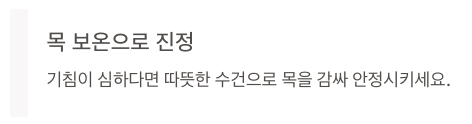 - 기침이 너무 심하면 따뜻한 수건으로 목을 감싸 안정시킬 것