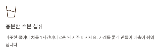 - 따뜻한 물이나 차를 1시간마다 소량씩 자주 마시기