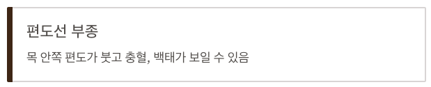 - 증상: 목 안쪽 편도선이 붓고 충혈, 침 삼킬 때 통증 심함, 열 발생