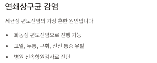 - 대표 원인: 연쇄상구균(Group A Streptococcus)