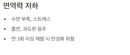 - 수면 부족, 스트레스, 흡연, 음주 등으로 편도선 염증 재발률 증가