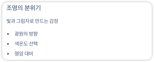 - 광원의 위치, 밝기, 색온도, 그림자 등