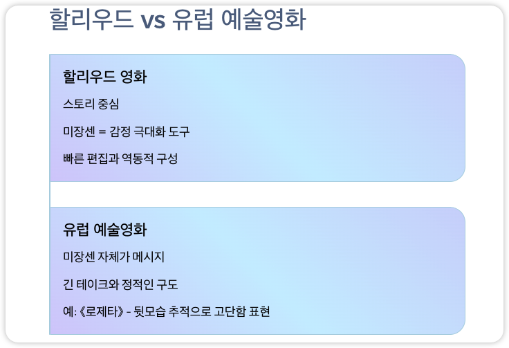 - 할리우드 영화: 스토리 중심, 미장센이 감정 극대화 도구로 사용됨