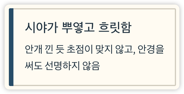 - 안개 낀 듯 흐려 보이고 초점이 잘 맞지 않음