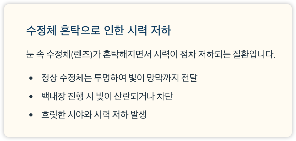 백내장은 눈 속 수정체(렌즈)가 혼탁해지면서 시력이 점차 저하되는 질환입니다.