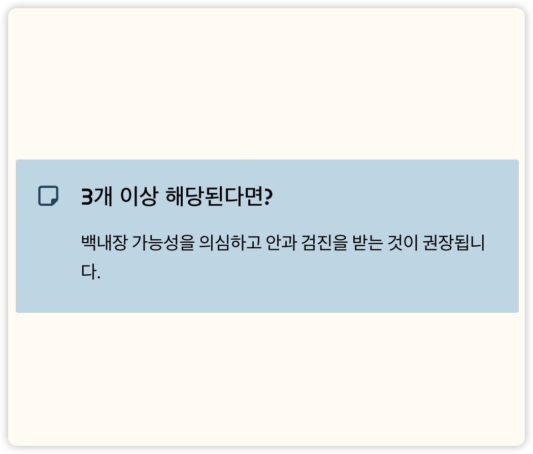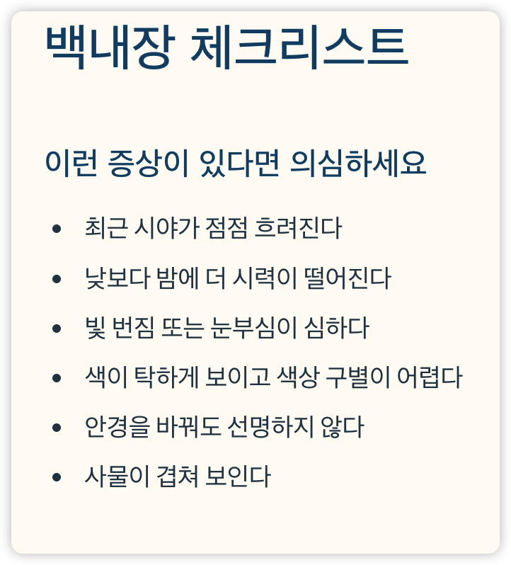 ✅ 위 항목 중 3개 이상 해당된다면 백내장 가능성을 의심하고 안과 검진을 받는 것이 권장됩니다.