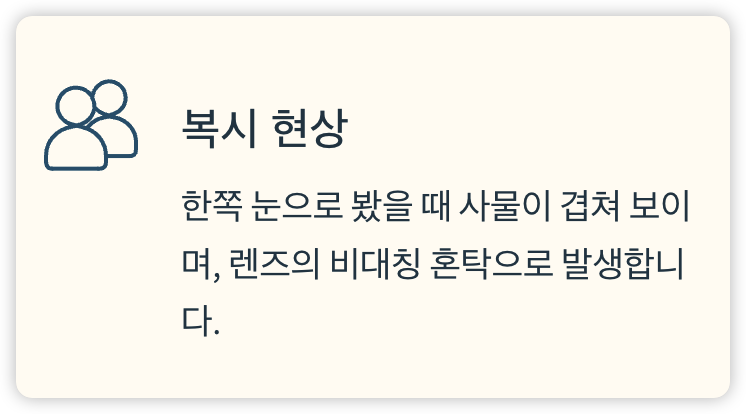 - 특히 수정체 혼탁이 중심부에 있을 때 증상이 심함