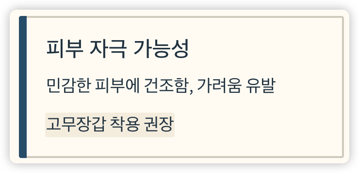 - 민감한 피부에 직접 닿을 경우 건조함, 가려움 유발 가능