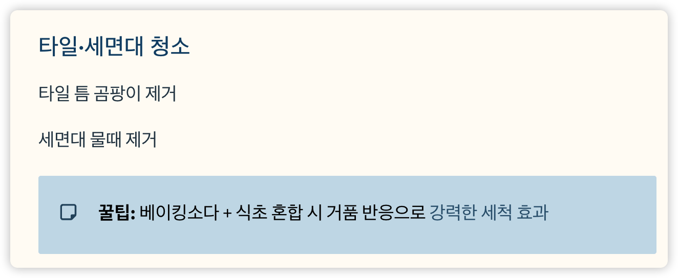 - 베이킹소다 + 식초 혼합 시 거품 반응으로 강력한 세척 효과