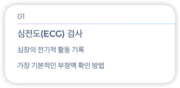 가장 기본적인 검사로 심장의 전기적 활동을 기록하여 부정맥 유무를 확인합니다.