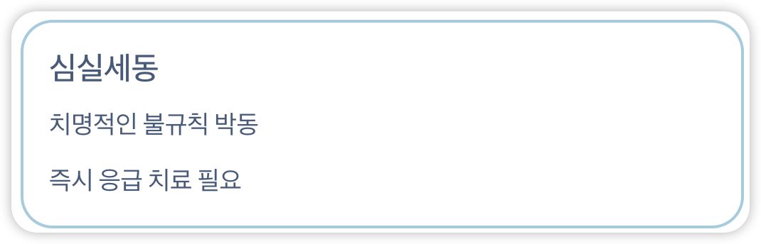 - 심실세동(치명적인 불규칙 박동, 즉시 치료 필요)
