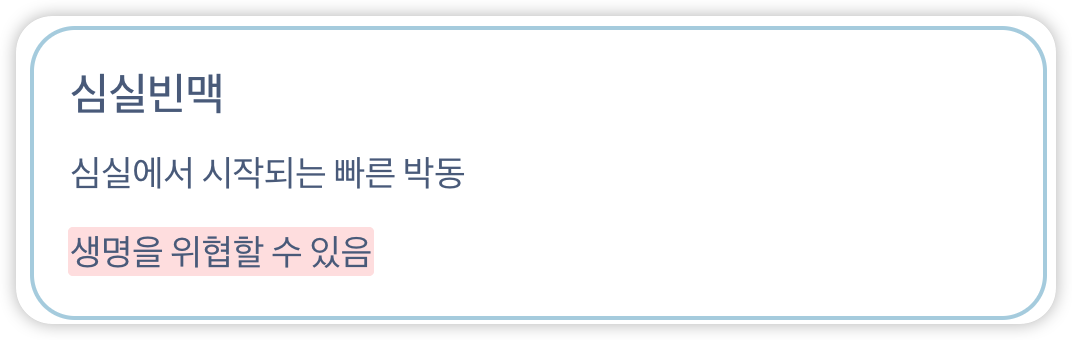 - 심실빈맥(심실에서 빠르게 박동, 생명 위협 가능)