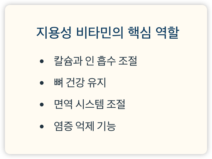비타민 D는 지용성 비타민으로, 칼슘과 인의 흡수를 조절해 뼈 건강을 유지하는 데 중요한 역할을 합니다.