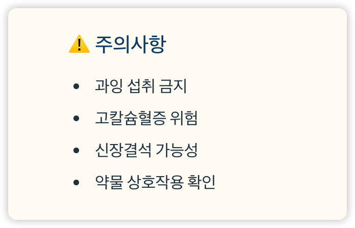 - 과잉 섭취는 고칼슘혈증, 신장결석 등 부작용 유발 가능