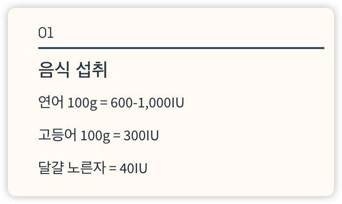 비타민 D가 풍부한 식품(등푸른 생선, 달걀 노른자, 간 등)을 충분히 섭취하지 않으면 음식만으로는 보충이 어렵습니다.