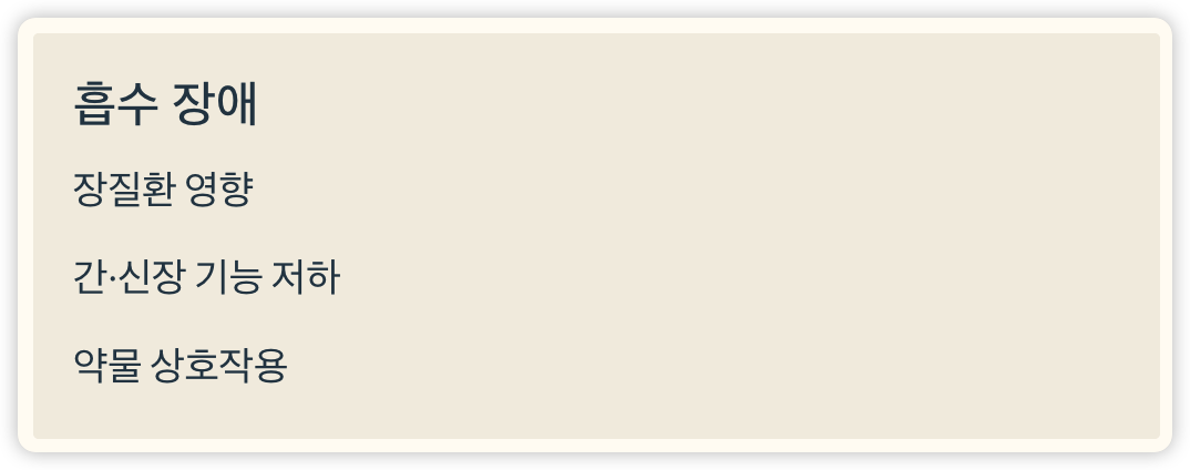 장질환(크론병, 셀리악병 등)이나 간·신장 기능 저하 시 비타민 D 흡수 및 활성화가 저해될 수 있습니다.
