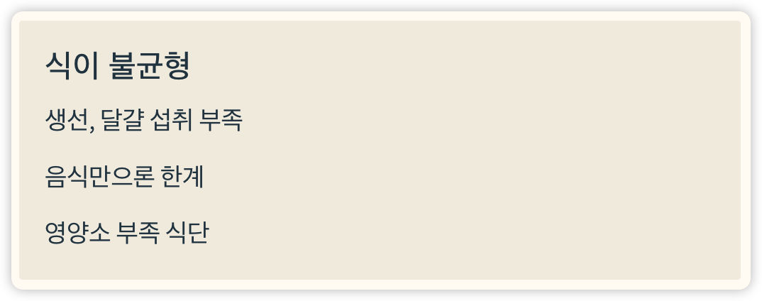 ✅ 하지만 식이로만 권장량(800~1,000IU)을 채우기엔 한계가 있습니다.