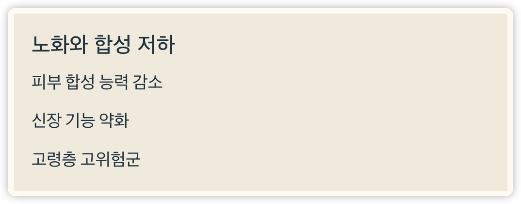 나이가 들수록 피부의 비타민 D 합성 능력과 신장 기능이 떨어지며, 이는 고령자의 결핍 위험을 높입니다.