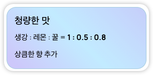 | 청량한 맛 | 생강 : 레몬 : 꿀 = 1 : 0.5 : 0.8 | 상큼한 향 추가 |