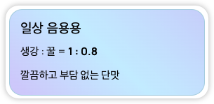 | 일상 음용용 | 생강 : 꿀 = 1 : 0.8 | 깔끔한 단맛 |
