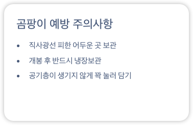 🚫 곰팡이가 생기면 즉시 걸러내고, 상층부를 버린 뒤 새 용기에 옮겨 담으세요.
