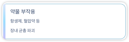 | 약물 부작용 | 항생제, 혈압약, 다이어트 보조제 등으로 인한 장내 균총 파괴 |