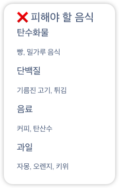- 카페인·탄산음료·우유는 피하기 (장 자극 유발)
