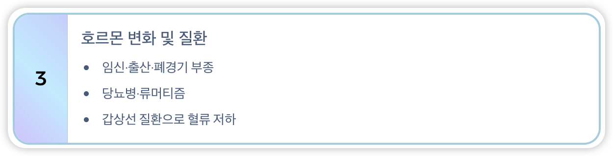- 당뇨병·류머티즘·갑상선 질환: 신경의 혈류 저하로 손상 촉진