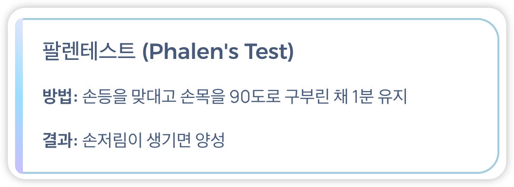 | 팔렌테스트 (Phalen’s Test) | 손등을 맞대고 손목을 90도로 구부린 채 1분 유지 | 손저림이 생기면 양성 |