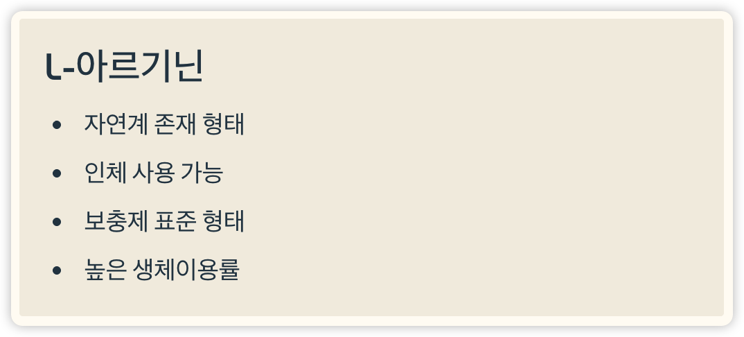 - 보충제나 영양제는 대부분 L-아르기닌 형태로 제공