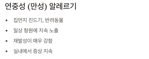 - 연중성 (만성): 집먼지 진드기, 반려동물 등 일상 항원에 지속 노출되어 재발성 강함.