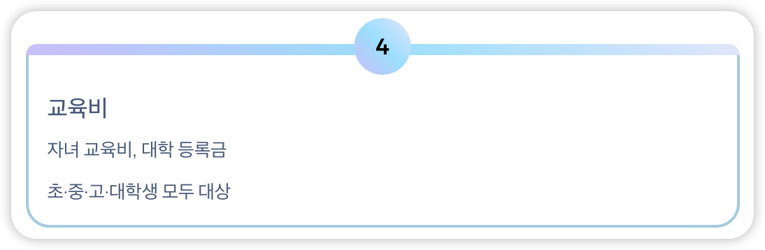 | 교육비 공제 | 자녀 교육비, 대학 등록금 등 | 초·중·고·대학생 자녀 모두 공제 대상 |