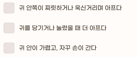 아래 항목 중 3개 이상 해당된다면 외이도염 가능성이 있습니다.