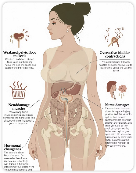 - 절박성 요실금: 갑작스럽게 소변이 마려워 참지 못하고 새는 경우 (과민성 방광 원인)