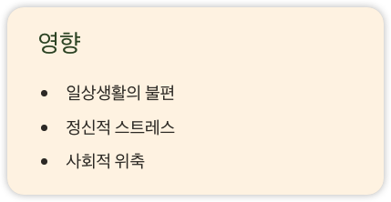 일상생활의 불편은 물론 정신적 스트레스와 사회적 위축을 유발할 수 있습니다.