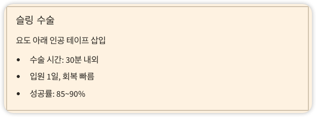 | 심한 복압성 요실금 | 슬링 수술 | 효과적이며 재발률 낮음 |