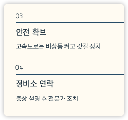 - 안전 확보 – 고속도로라면 비상등 켜고 갓길 정차