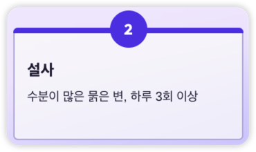 | 설사 | 수분이 많은 묽은 변, 하루 3회 이상 발생 |