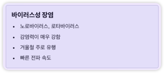 - 바이러스성 장염: 노로바이러스, 로타바이러스 등이 주요 원인. 감염력이 매우 강해 겨울철 유행.