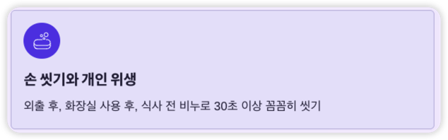 - 외출 후, 화장실 사용 후, 식사 전에는 반드시 손을 비누로 30초 이상 꼼꼼히 씻기