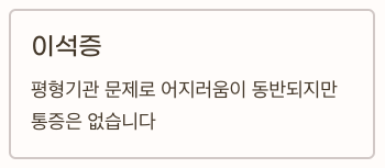 - 이석증: 귀 속 평형기관 문제로 어지러움 동반. 통증은 없음.