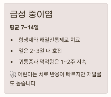 - 열은 2~3일 내 떨어지지만 귀통증과 먹먹함은 1~2주 지속 가능