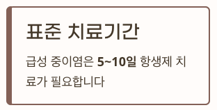 - 대부분의 급성 중이염은 항생제 치료를 5~10일 정도 시행합니다.