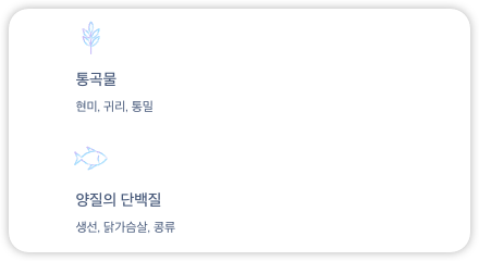 - 곡물: 현미, 귀리, 통밀 등 통곡물 위주