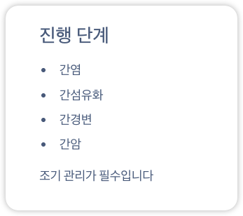 제대로 관리하지 않으면 간염 → 간섬유화 → 간경변 → 간암으로 진행될 수 있습니다.