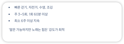 - 주 3~5회, 1회 60분 이상, 최소 6주 이상 지속