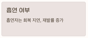 | 흡연 여부 | 흡연자는 회복 지연, 재발률 ↑ |