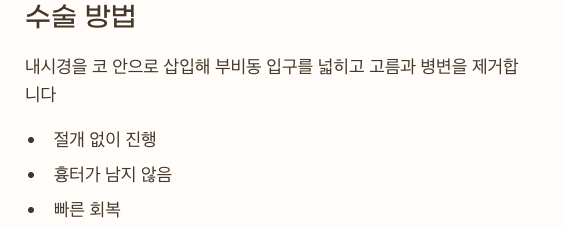| 수술 범위 | 코용종 제거 등 추가 수술 시 회복기간 ↑ |