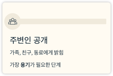 커밍아웃은 한 번에 이루어지는 것이 아니라, 여러 단계를 거쳐 진행됩니다.