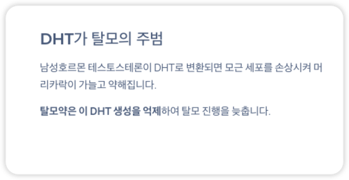 이 DHT가 탈모의 주원인으로, 모근 세포를 손상시켜 머리카락을 가늘고 약하게 만듭니다.